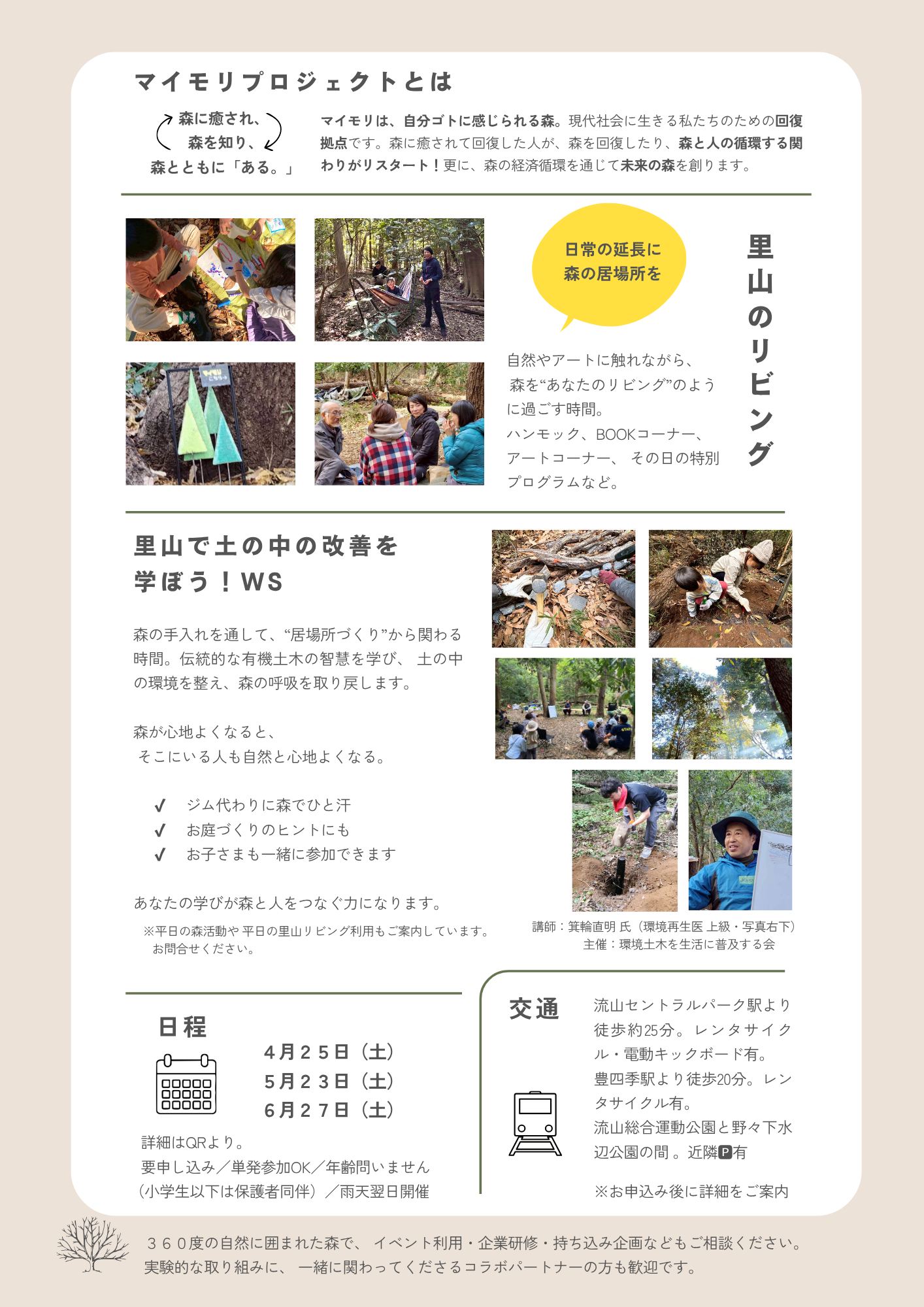 「人も森も気持ちがいい空間」「ありのままの自然の美しさを引き出す」をテーマに、有機土木(土中環境改善)という伝統的な手法をベースに森のお手入れをします。環境再生医の指導の元、他の里山ではなかなかできない体験もしていただけます。共同作業などもあり、アットホームな雰囲気で楽しくご参加いただけます。年齢や性別問わずご自身で取り組めそうなことをしていただきますので、初めての方も安心してご参加ください。